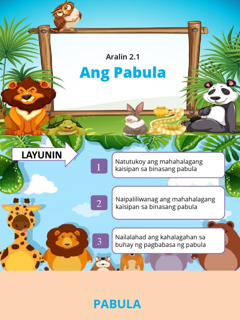 PABULA Sa paksang ito ating aalamin kung ano nga ba ang ibat-ibang elemento ng mga pabula at ang mga halimbawa nito na makikita sa mga kwento. Sa akdang ito ang mga hayop ay kumikilos at nakakapagsalita tulad ng mga tao. Isang tuka lamang ang takbo ng buhay.