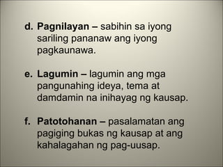 Ang dalawang tao ay dumudulog sa diyalogo nang may lubos na pagbubukas ng sarili at tiwala sa isat isa. Napapataas at napapanatili ang pagkakakilanlan sa sarili Nalilinang ang kakayahang makipag-uganayan at pakikipagpalitan ng impormasyon sa ibang tao. 2014-02-09 Ano ba ang kaugnayan ng wika sa kultura.