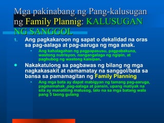 Family Planning Ang Family Planning ay ang pagtulong sa mga mag-asawa o indibidwal na makamit ang hustong bilang ng pamilya sa isang katangian ng pagiging. Kayat mahalaga na mabigyan ang mga magkapareha ng nararapat at ligtas na paraan ng kontrasepsyon. Ang pagkakaroon ng sapat at dekalidad na oras sa pag-aalaga at pag-aaruga ng mga anak ay nakakatulong sa pagbawas ng bilang ng mga nagkakasakit at.