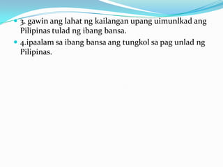 Itoy dahil ang mga awiting bayan ay naging parte ng ating kasaysayan at kultura. Dito nasusukat ang kanyang pagmamahal na hinding-hindi niya ipagpapalit sa anumang lahi ang kanyang nakagisnang kultura dahil ang pagiging isang nasyonalismo ay isang salik upang umunlad ang isang nayon at labanan ang anumang pantig ng kasakiman na. Ano ang kahalagahan ng kalakalan sa pag-unlad ng isang bansa.