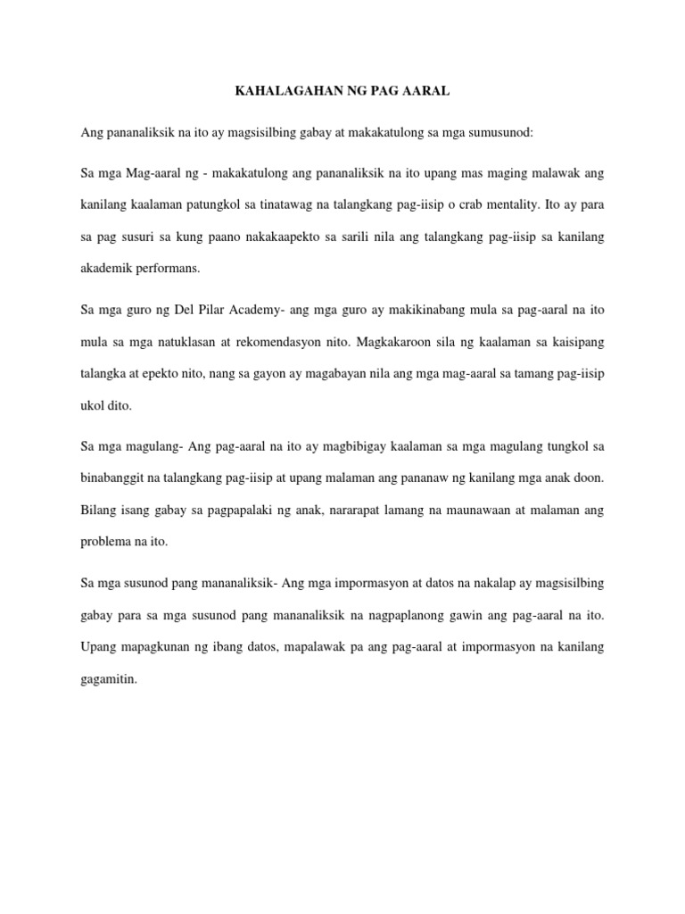 Kahalagahan ng pag-aaral Ang pananaliksik na ito ay mahalaga sa mga sumusunod. Maaari ring magamit ng mga susunod na mananaliksik ang pag-aaral na ito upang. Ito rin ay makakatulong para sa pagbuo ng mabuting asal.