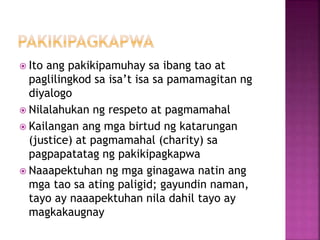 Ang Kahalagahan ng Diyalogo Ang Kahalagahan ng Pagkakaisa Komunikasyon at Pagtutulungan Ang Kahalagahan ng Pagbuo at Pagsali sa mga Samahan Pakikipagkapwa-tao. Itinuturing na malaki ang naging ambag ng mga katutubo sa pag-unlad na tinatamasa ngayon ng wika Gamit ang mga makabagong teknolohiya nagagawa ng wika na mas mapaglagom pa lalo ang saklaw. Komunikasyon at pagtutulungan B.