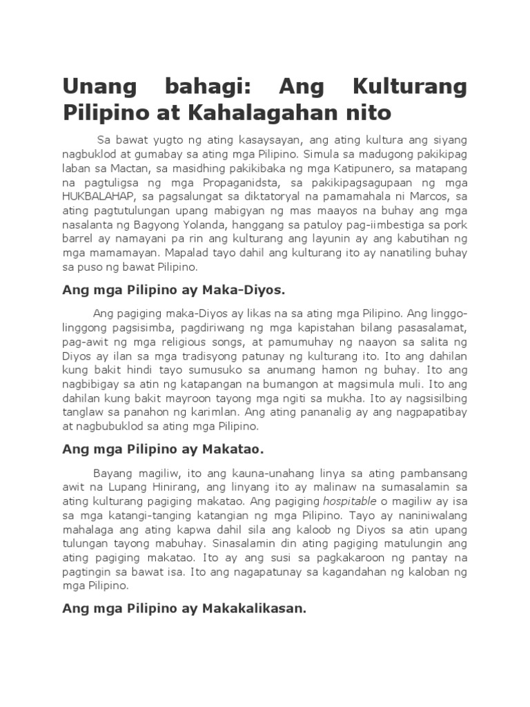 Sa bawat yugto ng ating kasaysayan ang ating kultura ang siyang nagbuklod at gumabay sa ating mga Pilipino. Ang kahalagahan ng wikang Filipino sa kolehiyo ayon kay Dr. Sa kabuuan may 40 araw sa pag-obserba ng Mahal na Araw na.